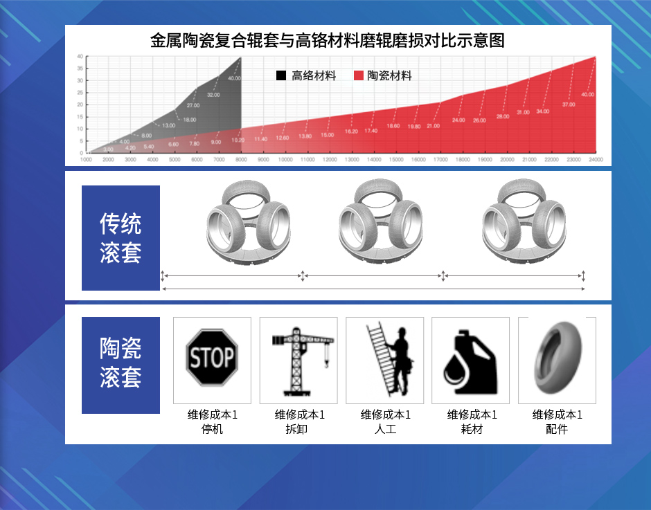 陶瓷復(fù)合輥套使用壽命長(zhǎng),備件磨損小,不會(huì)導(dǎo)致磨機(jī)時(shí)常出力不夠,備件磨損較大、臺(tái)時(shí)產(chǎn)量低、需要停機(jī)、檢修、拆卸、配件更換、產(chǎn)品交貨拖期、人工等費(fèi)用,從而為企業(yè)大大降低年運(yùn)營(yíng)成本30%。